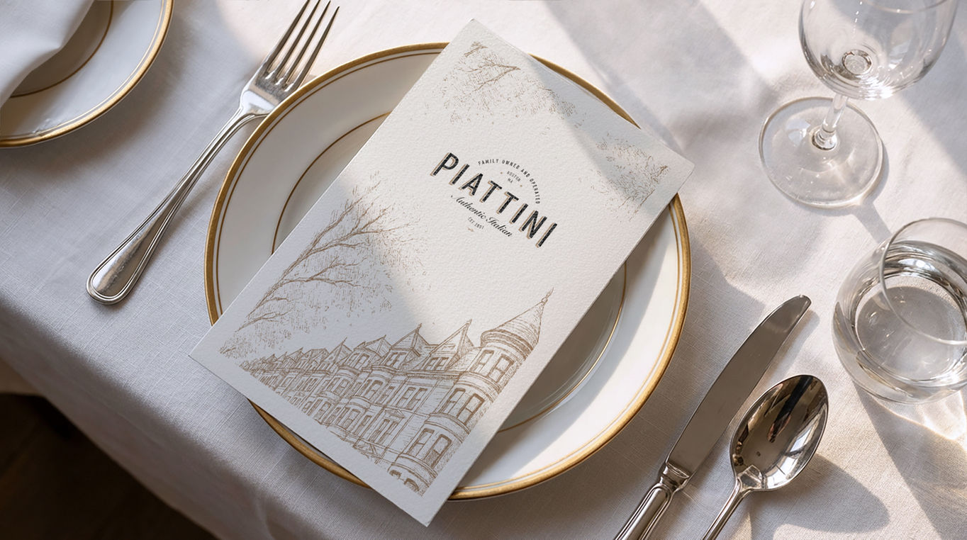 The new visual identity reinterprets Back Bay’s distinctive architecture. Facades, corners, and urban rhythms become graphic elements that evoke a sense of place and belonging. Illustrations inspired by Newbury Street connect the restaurant to the city’s collective memory, positioning Piattini not only as a dining destination, but as part of Boston’s everyday life.